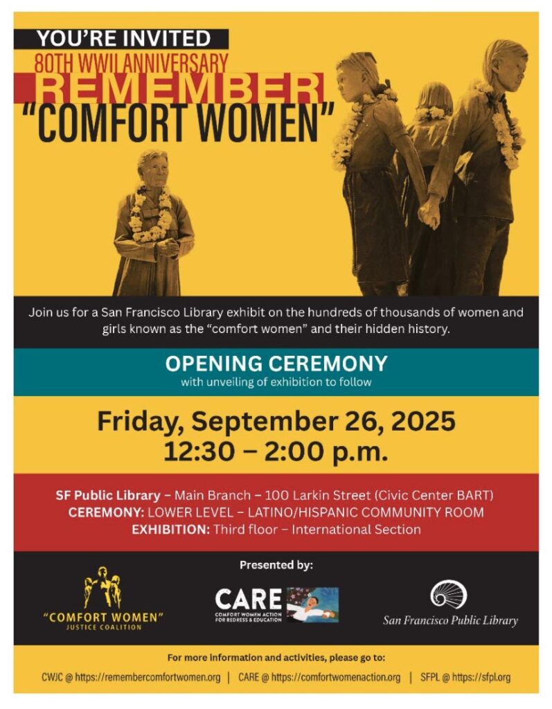 On September 26th, more than 150 people squeezed into the lower room of the Main Branch of the SF Library in order to honor the “comfort women:” The hundreds of thousands of women and girls who were sexually abused during WWII. The occasion? A new exhibit featuring photos, copies of original paintings, maps and resources.