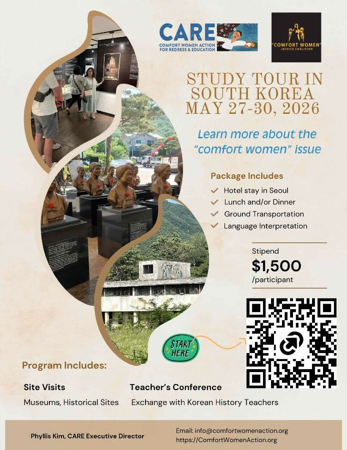Post published:January 9, 2026 Post category:2025 Events / CWJC Statement / CWJC Updates / Solidarity Help us send teachers for this important education opportunity. Help us give aid to the few survivors of Japanese war crimes! Scan the QR code in the ad for more info. Read more articles Previous PostCountering History Denialism Next PostNewsletter – December 2025 You Might Also Like Goodbye 2020, Hello 2021 December 31, 2020 JOIN US NANJING MASSACRE 85th ANNIVERSARY Nanjing Ji 南京祭 2022 November 20, 2022 International Women’s Day Ceremony March 9, 2018